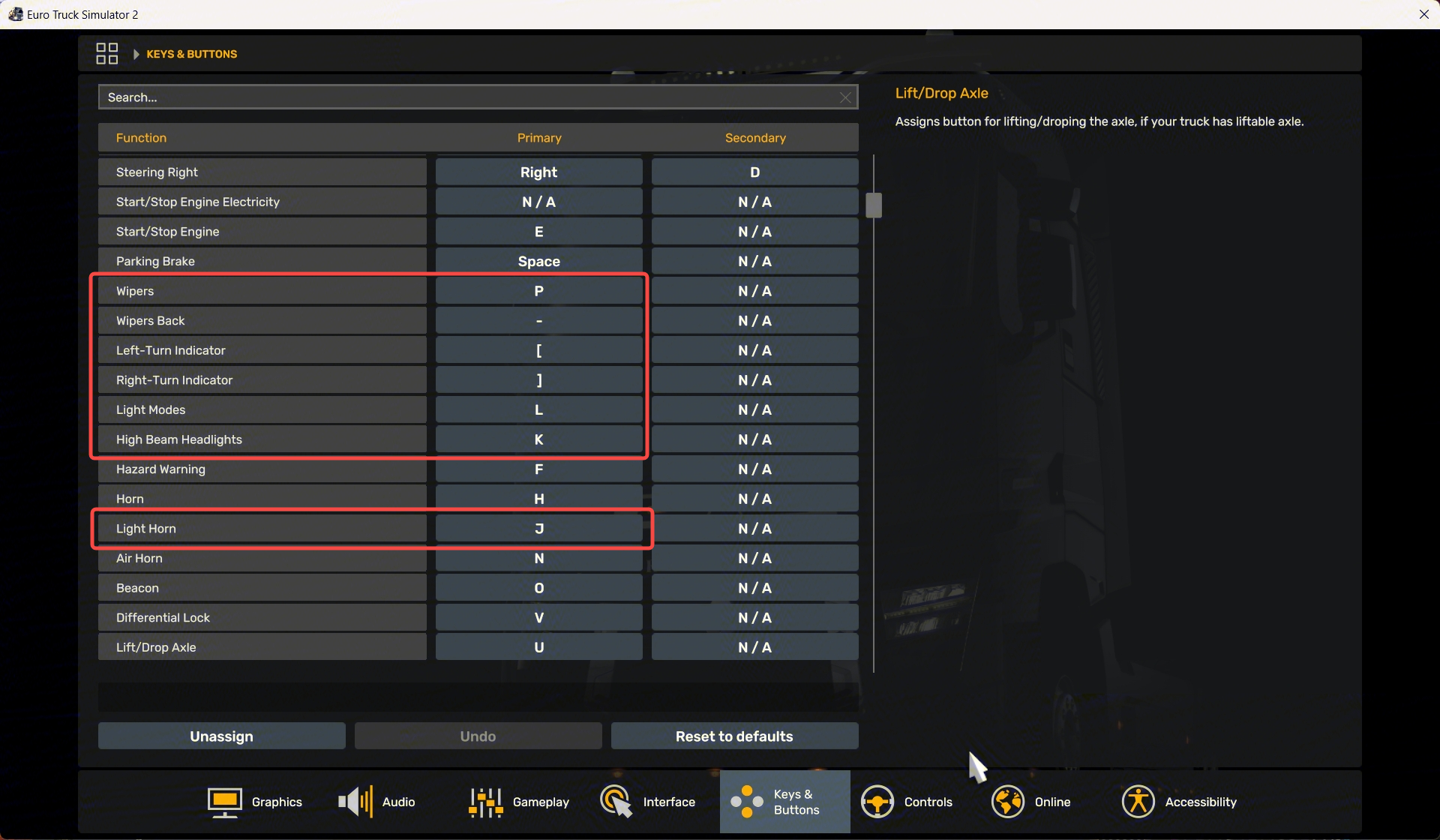 - In the game, go to the key and button configuration menu for ETS2 and ATS. Click Restore to Defaults, then map the "Wipers Back" function to the "-" key on the keyboard. Ensure that the key mappings are consistent with the ones in the red box in the image below, so that the turn signal stalk, light knob, and wiper stalk will work correctly in the game. Other game functions can be freely assigned to unused buttons on Multi-function Stalk