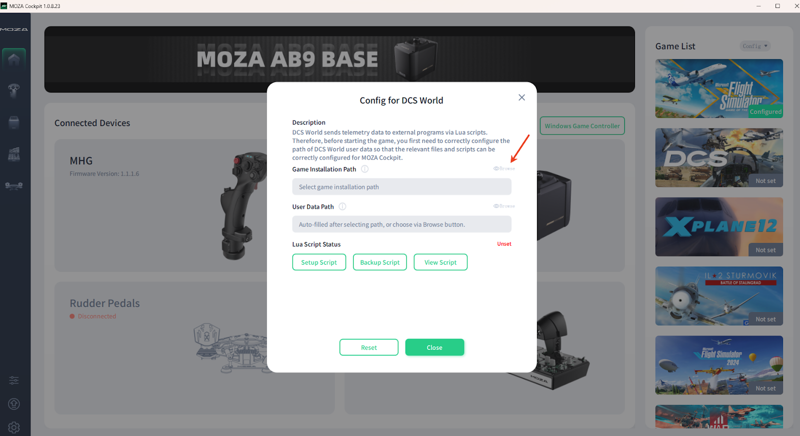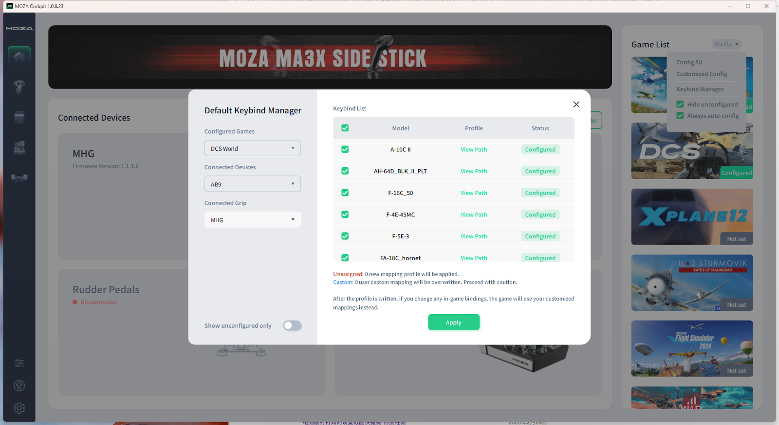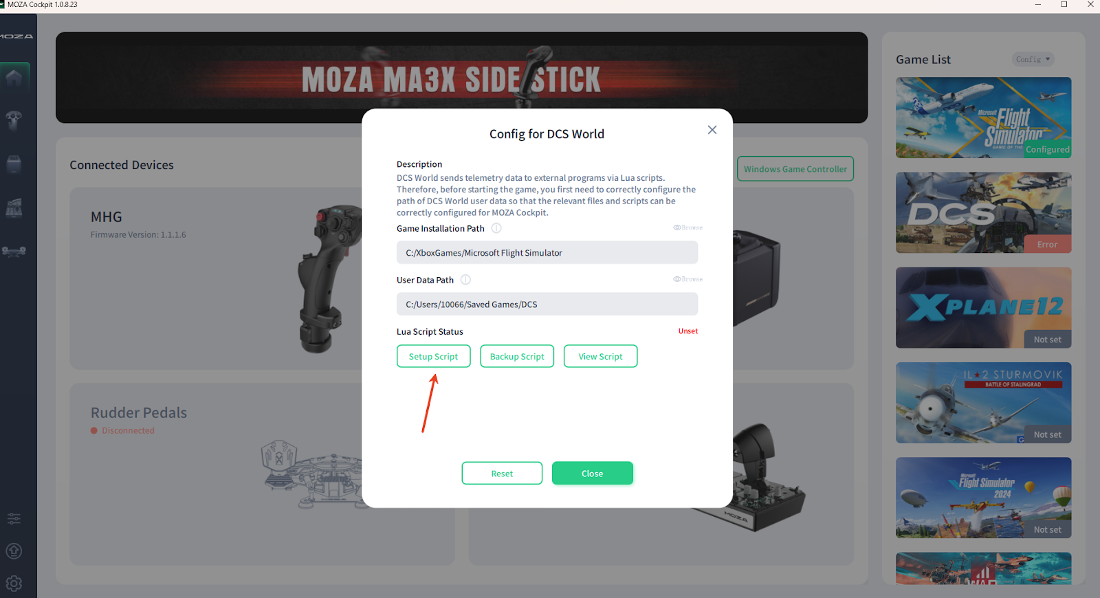 Starting from MOZA Cockpit v1.0.8, DCS and MSFS 2020 can be automatically configured with a single click.