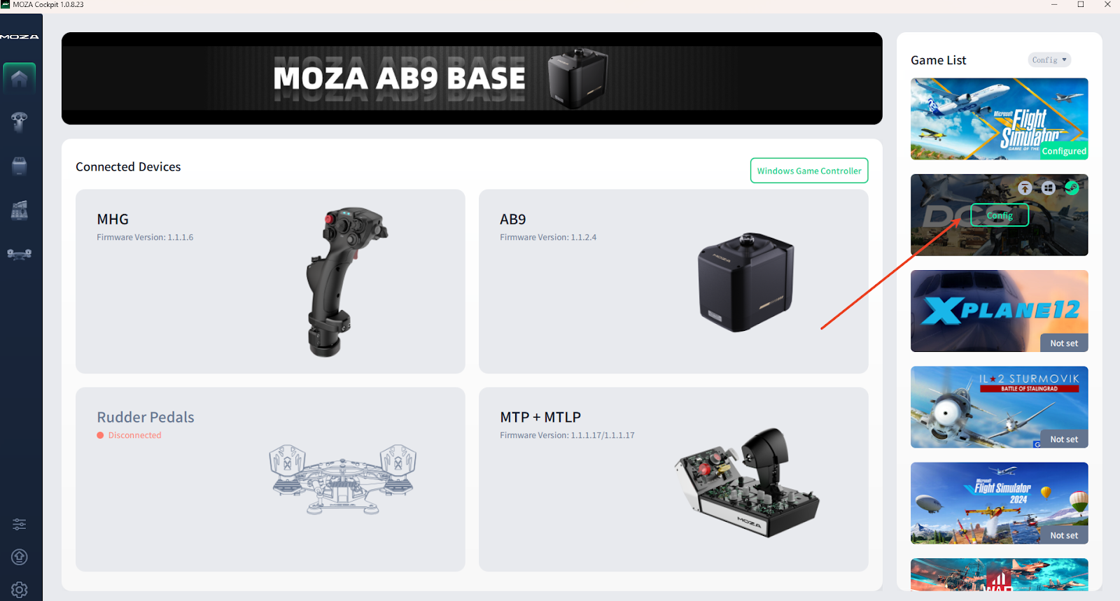 2. In MOZA Cockpit, find DCS in the Game List and click [Config].