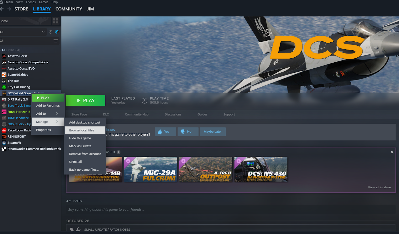 1. In Steam, go to your Library, find DCS, right-click it, and select