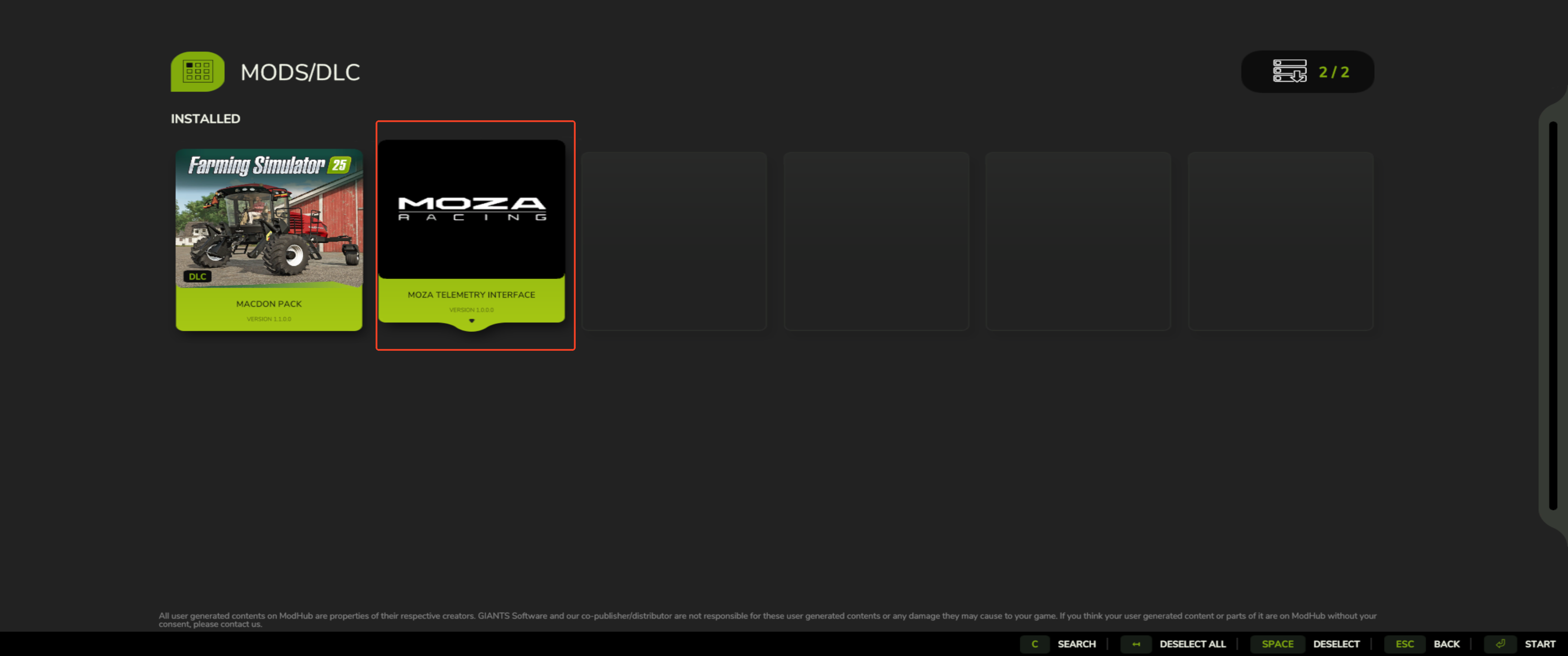Farming Simulator 22 Go to the MOZA Pit House installation directory. Copy the file located in MOZA Pit House\bin\GameConfigs\Farming Simulator 22\moza.zip to your PC folder: Documents\My Games\FarmingSimulator2022\mods