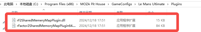 例:"*/MOZA Pit House/GameConfigs/Le Mans Ultimate/Plugins/rF2SharedMemeryMapPlugin.dll",下图所示: