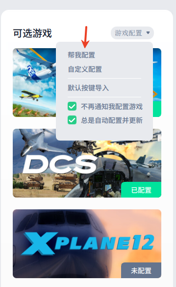 当我们下载好模拟飞行的游戏后,在MOZA Cockpit软件中右侧找到游戏列表上方,点击帮我配置,即可完成力回馈的配置。(PS:当完成一键配置后,如需自动配置新下载的游戏,请勾选【总是自动配置并更新】)