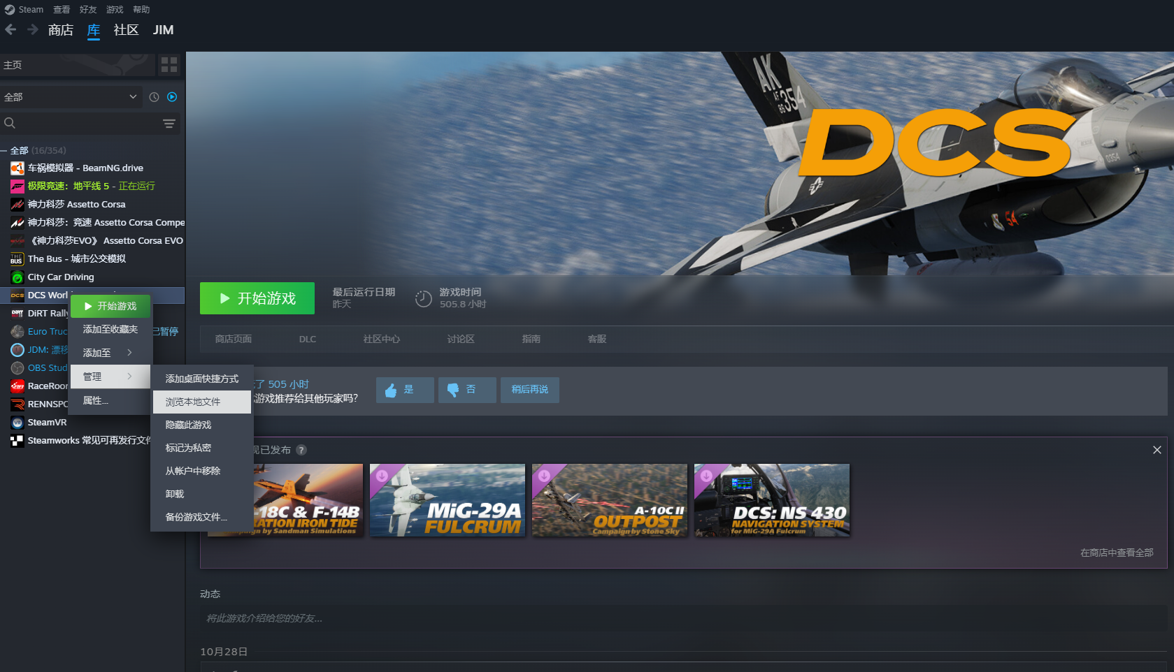 1.打开steam,选择自己的游戏列表,找到DCS,鼠标右键点击DCS。选择管理===》浏览本地文件