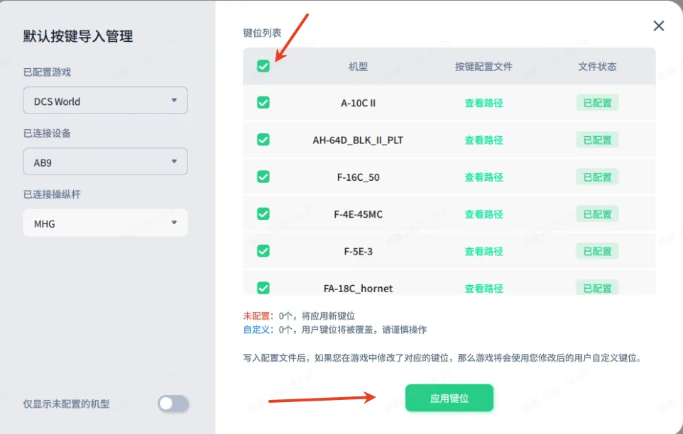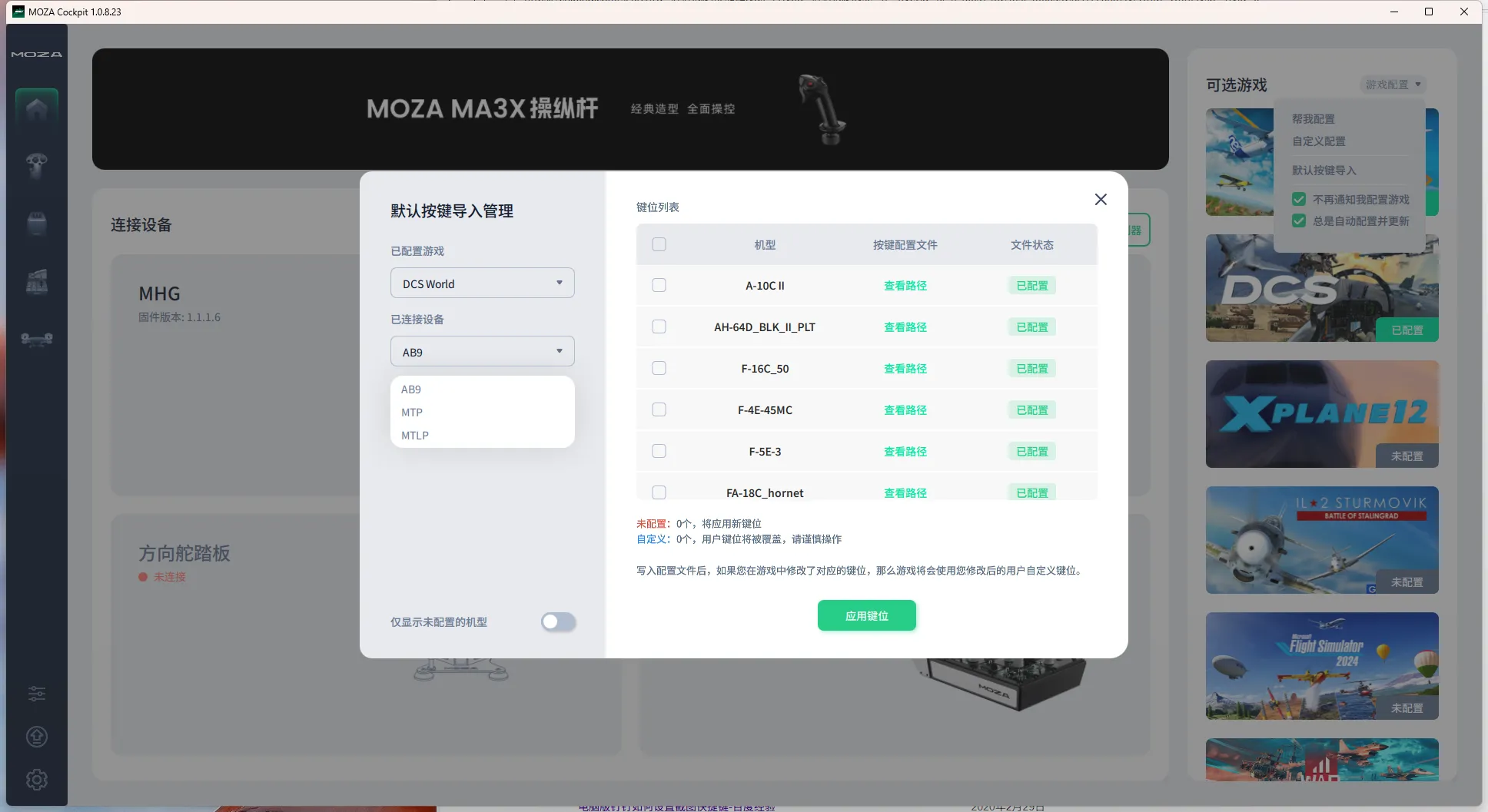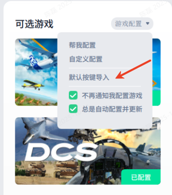 自动按键绑定部分新手用户强烈建议所有自动配置游戏按键的功能,完成以下步骤后,进入游戏后无需绑定飞行控制的各种功能(目前仅支持DSC和MSFS 2020,后续会更新更多游戏按键导入)