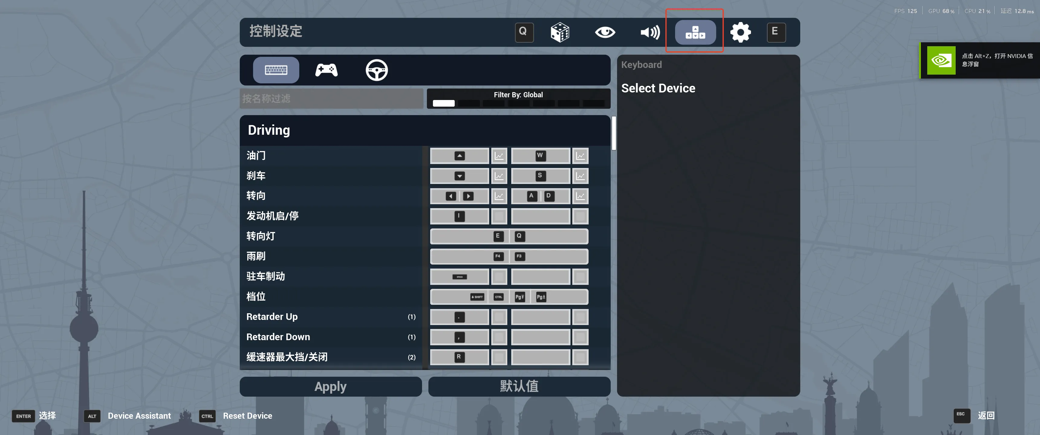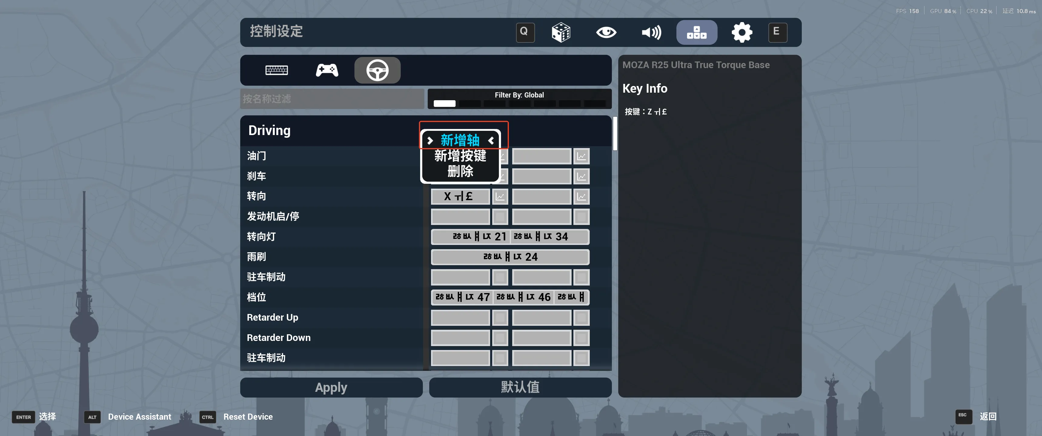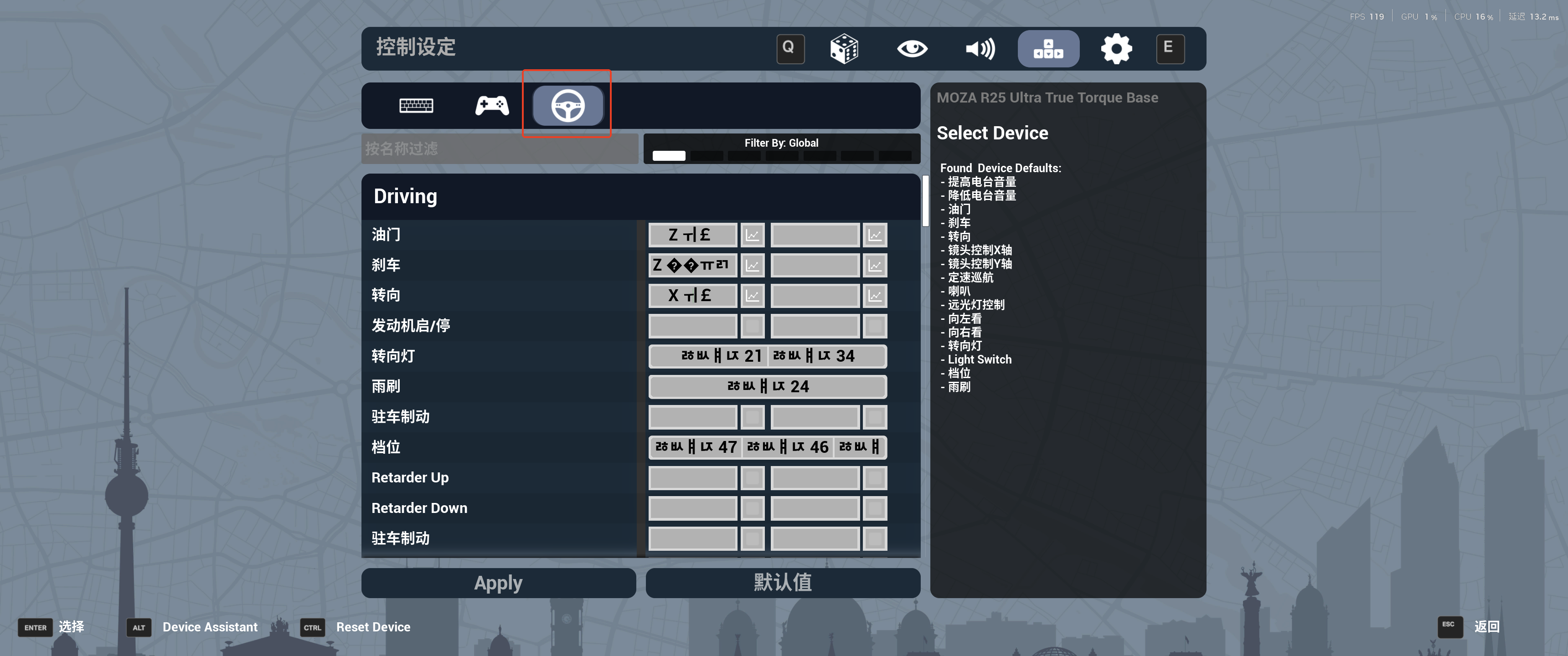 目录1.游戏安装2.力反馈配置3.遥测配置4.设备控制映射1.游戏安装可通过 Steam 等官方途径安装。2.力反馈配置官方默认适配。3.遥测配置进入游戏打开设置界面开启ENABLE TELEMETRY INTERFACE (BETA)功能, 开启后需要重启游戏。4.设备控制映射进入设置界面-控制设定选择到方向盘界面绑定需要的按键或者轴,绑定按键点击右侧空出,按压想要绑定的方向盘按键即可。 此处使用轴进行展示(选择需要绑定的踏板 - 新增轴) 。选择对应的轴 (踩对应踏板界面会有信号输出)选择默认值-0 即可绑定完成。