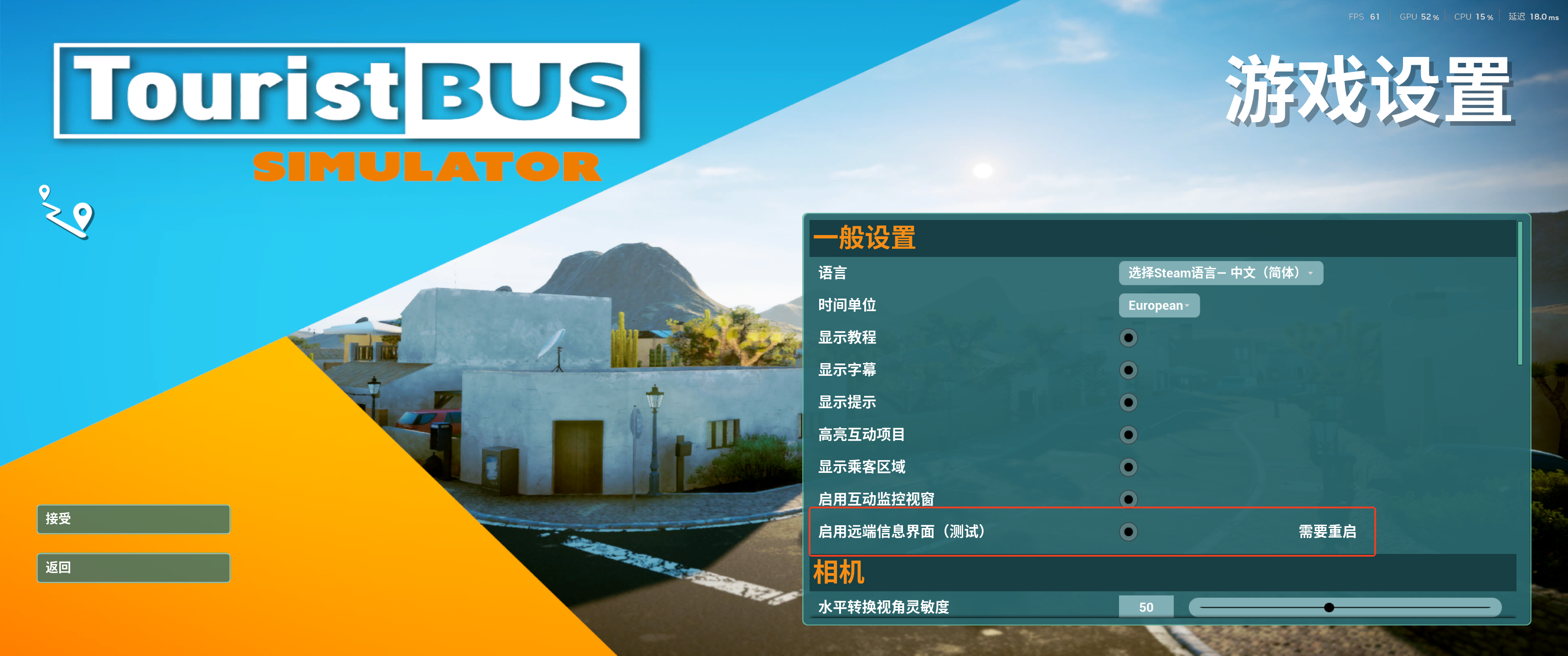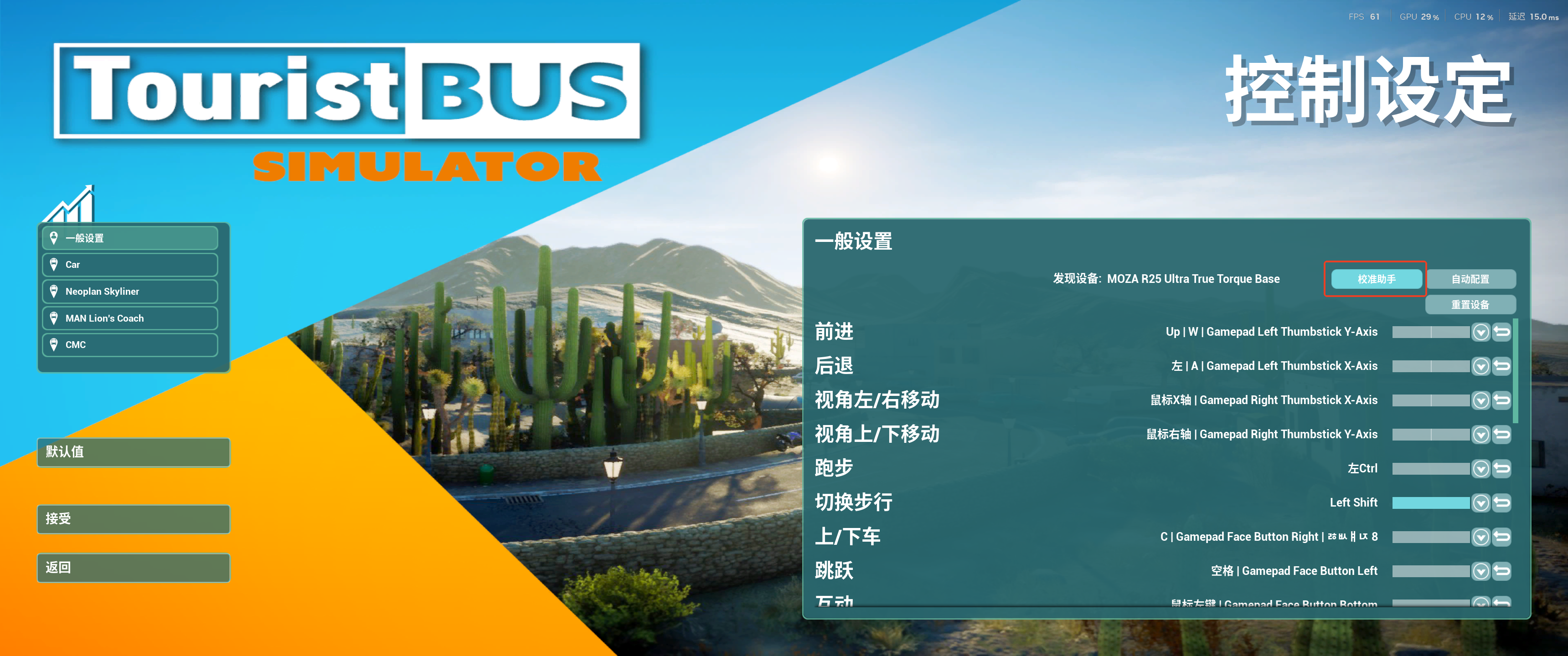 目录1.游戏安装2.力反馈配置3.遥测配置4.设备控制映射1.游戏安装可通过 Steam 等官方途径安装。2.力反馈配置官方默认适配。3.遥测配置进入游戏打开设置界面开启 启用远端信息界面(测试) 功能, 开启后需要重启游戏。4.设备控制映射基础按键已经默认绑定,如果需要绑定其他需要按键,可以打开控制设定校准助手可以重新绑定基础按键。如果需要绑定其他需要按键,可以选择需要绑定按键右侧向下箭头打开扩展界面,添加按键 - 按压方向盘需要绑定按键既可完成绑定